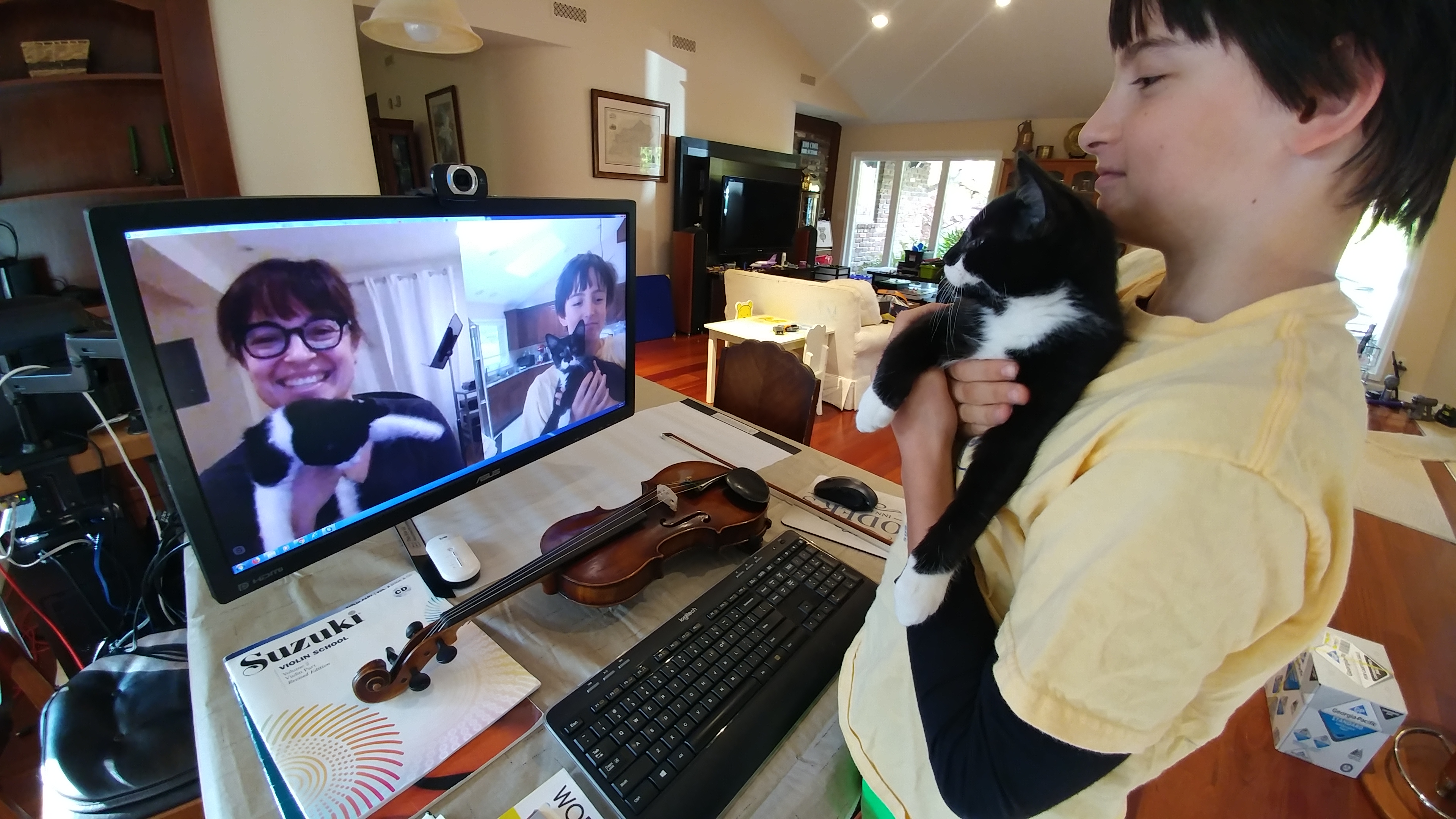 Our children take Skype violin lessons. During a short break, the teacher’s kitten meets our kitten.