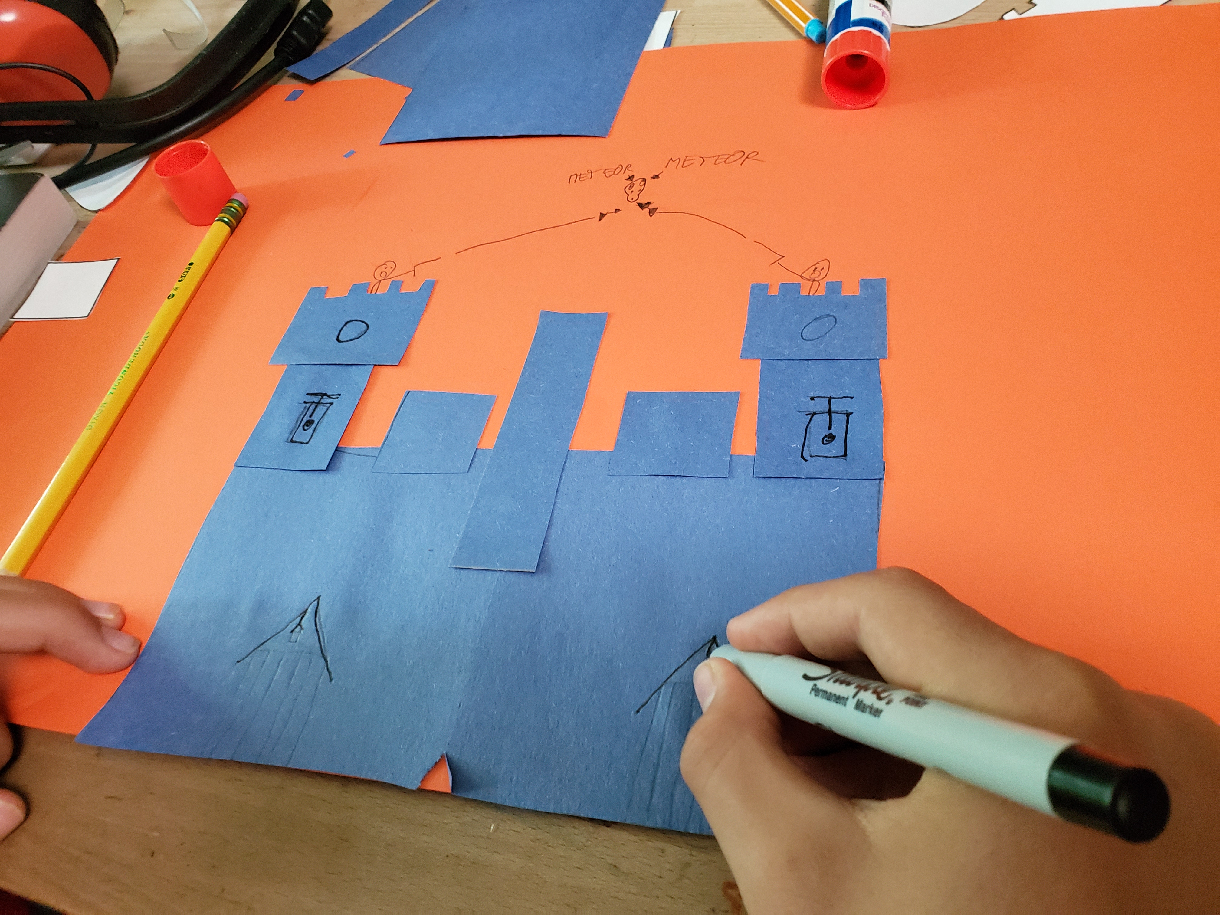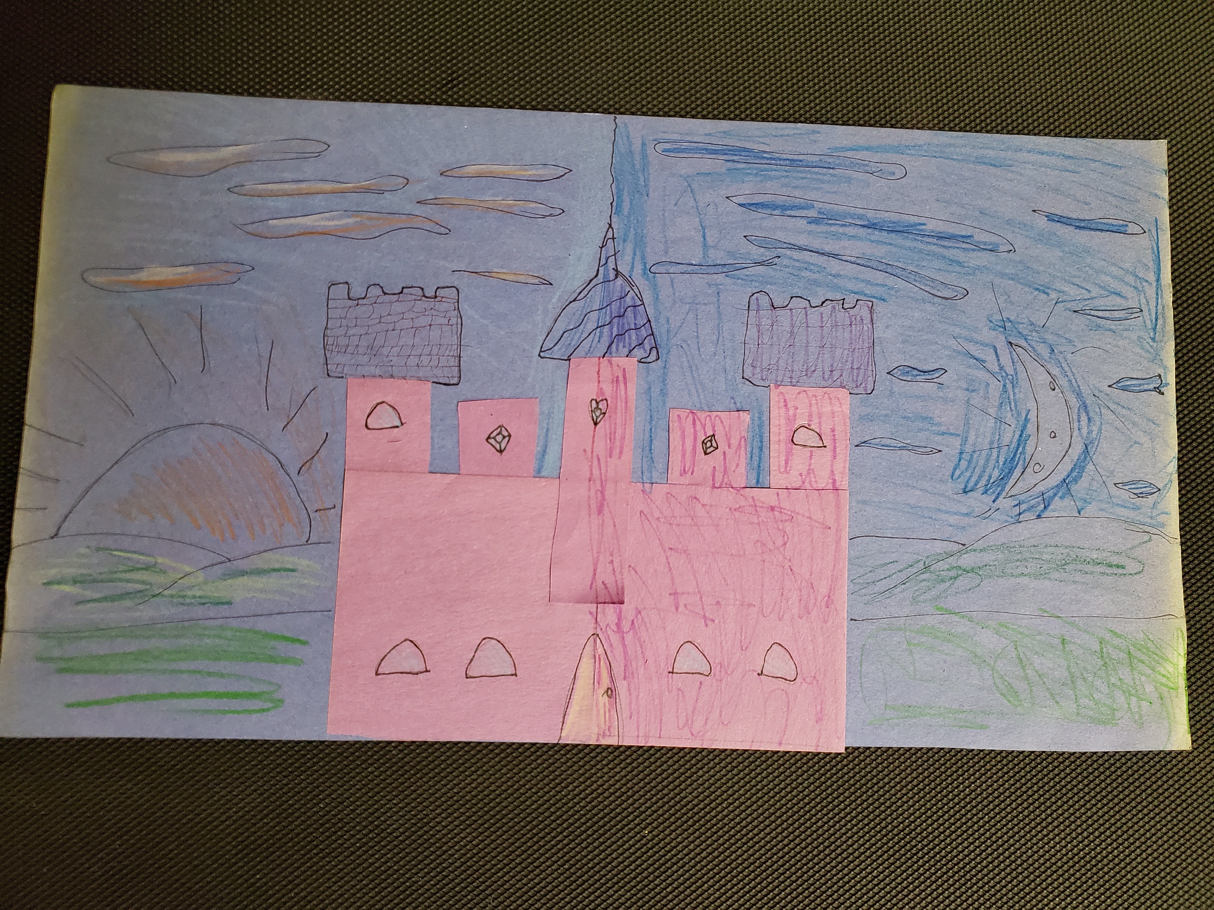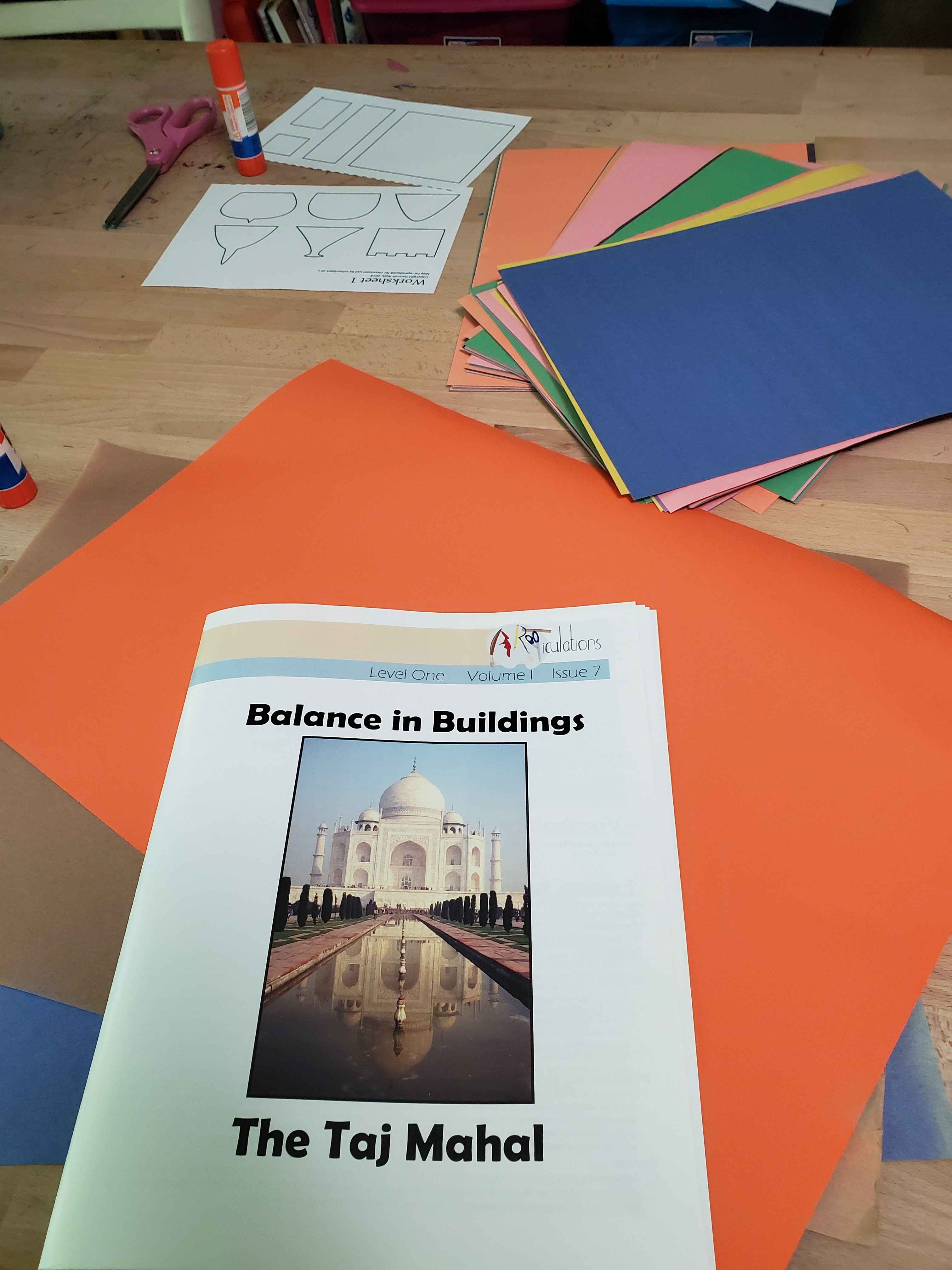 The kids and I worked on “Balance in Buildings – The Taj Mahal,” which was Level One, Volume 1, Issue 7. The steps were not hard to follow. I put all the supplies on the table before I called them to the room and then we started. I like the poster inside – a full-color picture of The Taj Mahal, 11″x17″. We would refer to it again and again as we followed the steps in creating our own version of it.
