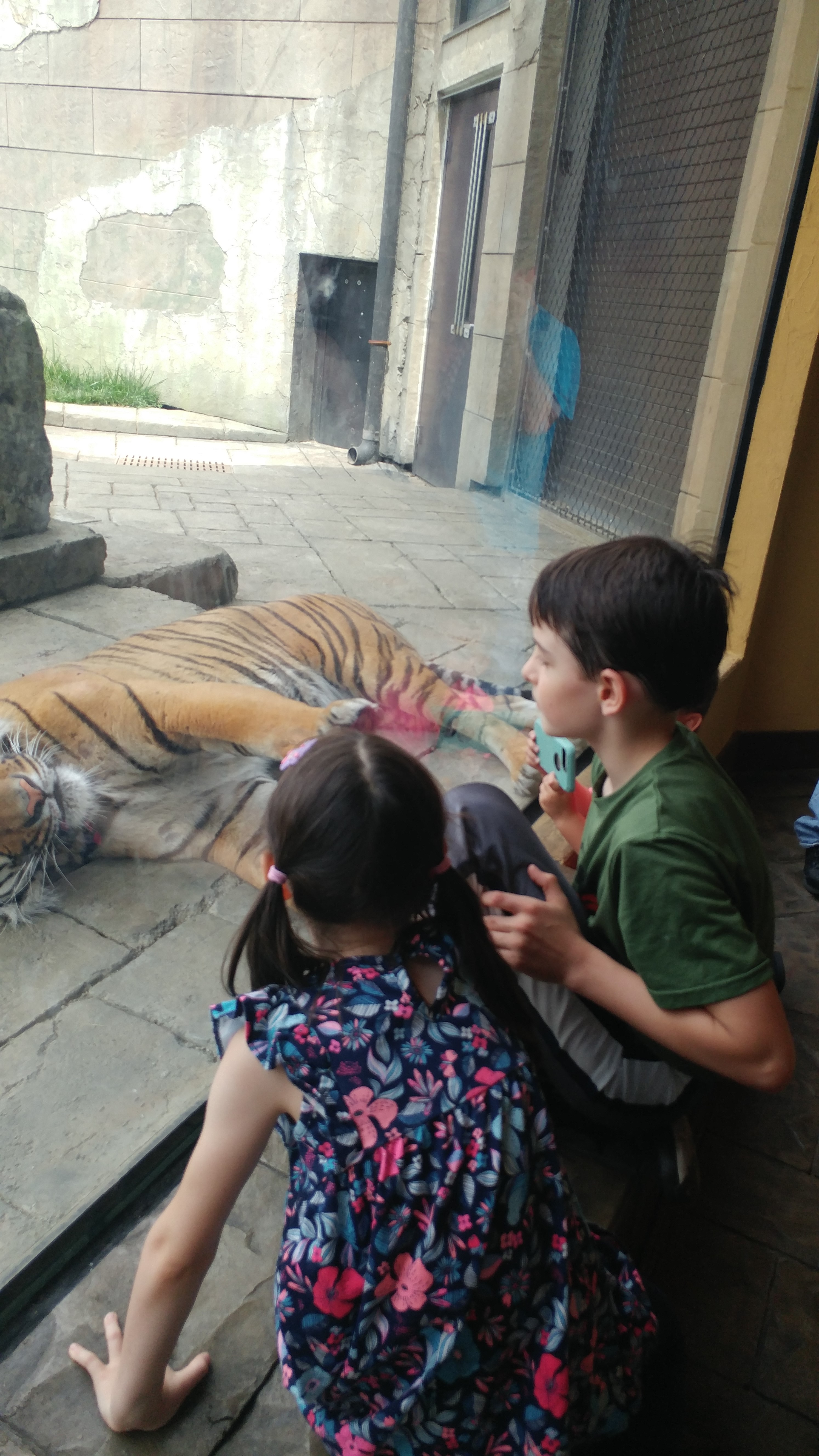 Through the thick glass, we can look at a tiger up close. If you remember, the tigers used to be in their own enclosure, pretty far away from the public. Now you can practically high five the tiger through the glass. My son did that.