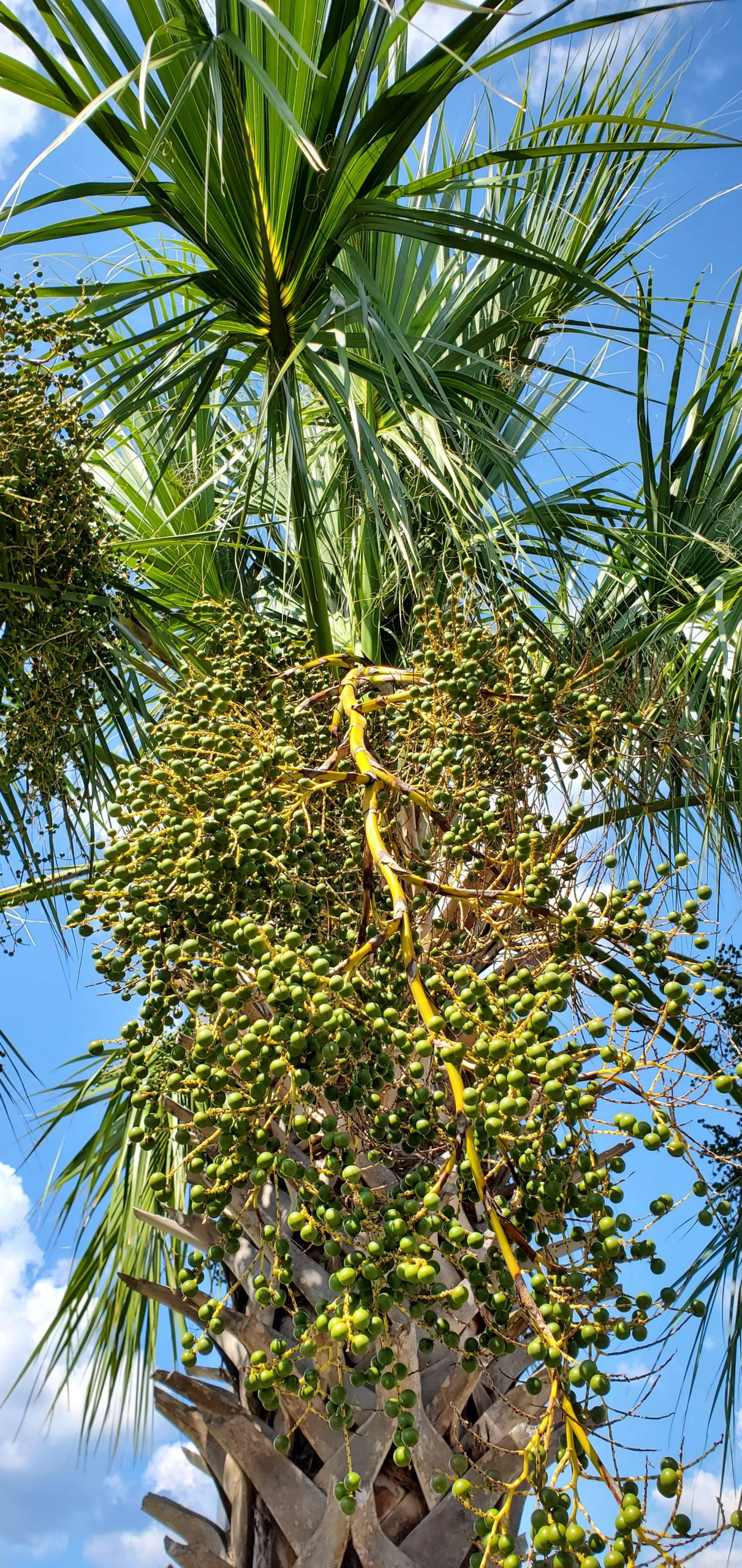 On the way there (a 7-hour trip by car), we stopped at a Cracker Barrel for lunch. In the parking lot, our daughter spotted something different in a palm tree. “What’s that?” she asked about these green berries hanging in clusters underneath the usual palm fronds. “We don’t know, but let’s look it up.” I took pictures and my iNaturalist app said it was a palm tree. Thanks a lot. So I Googled “berries on palm trees” and found out things we did not know.