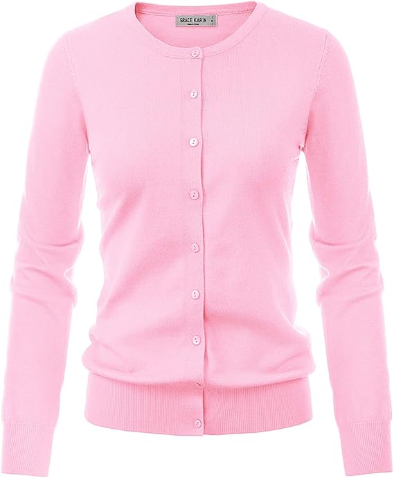 Top: Soft cotton or bamboo-blend cardigan in a pastel shade (e.g., blush pink) over a white or cream tee.