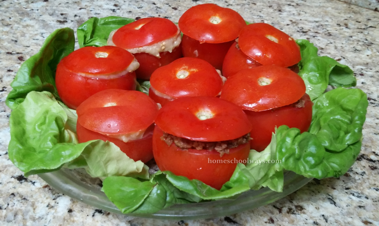 Tomatoes can be stuffed with different spreads or ground crumbles. I used Morning Star crumbles or similar vegetarian ground “beef” and eggplant spread to stuff my tomatoes.