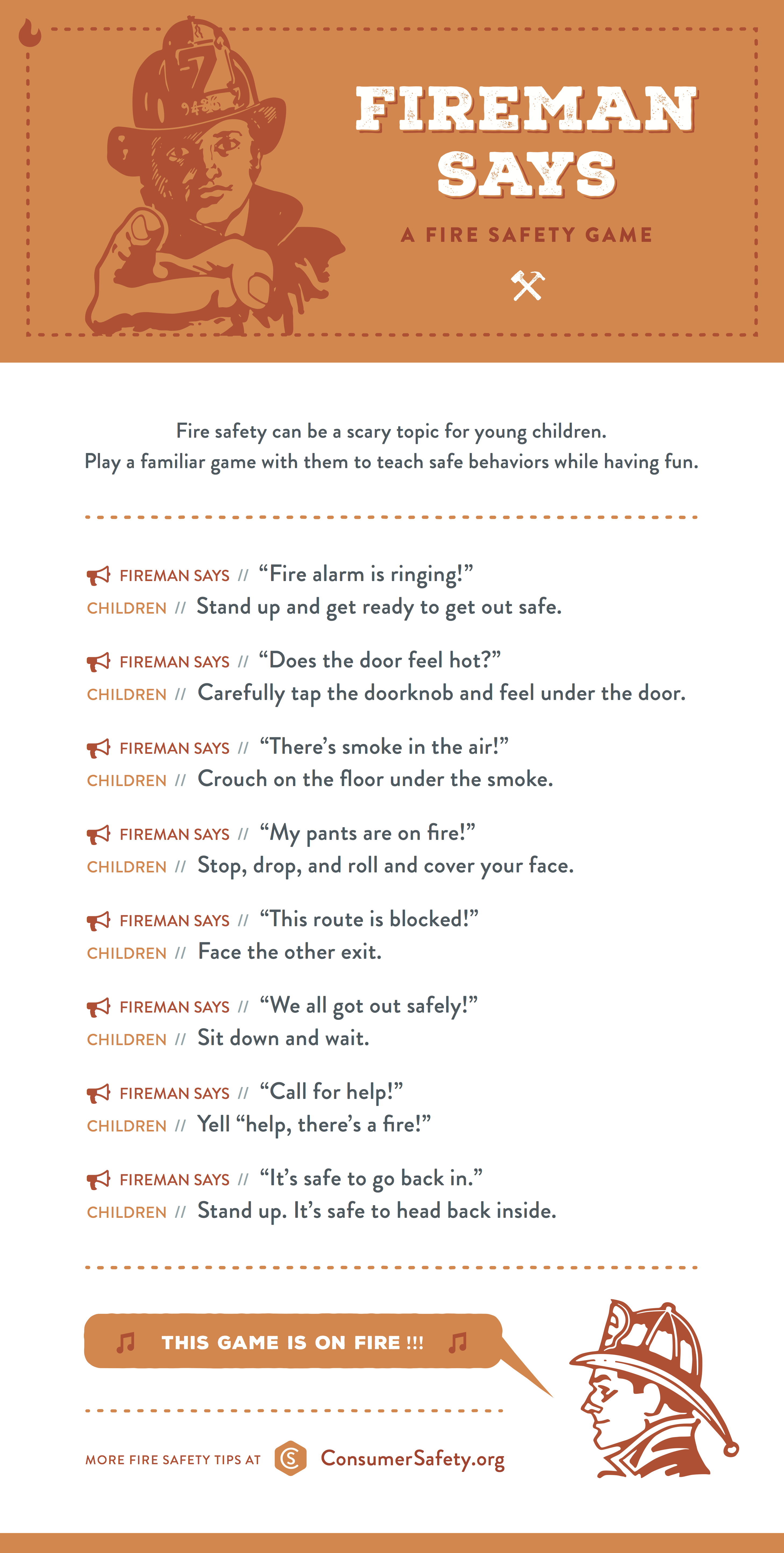 Here’s a game you can play with children, called Fireman Says, to instill the best responses to what can happen during a fire. Click on the link and scroll to the bottom to download the PDF. It was created by ConsumerSafety.org, where you can also read alerts about nightgown recalls. Children look so cute in PJs and nightgowns, but we should never forget to check these garments for fire safety standards.