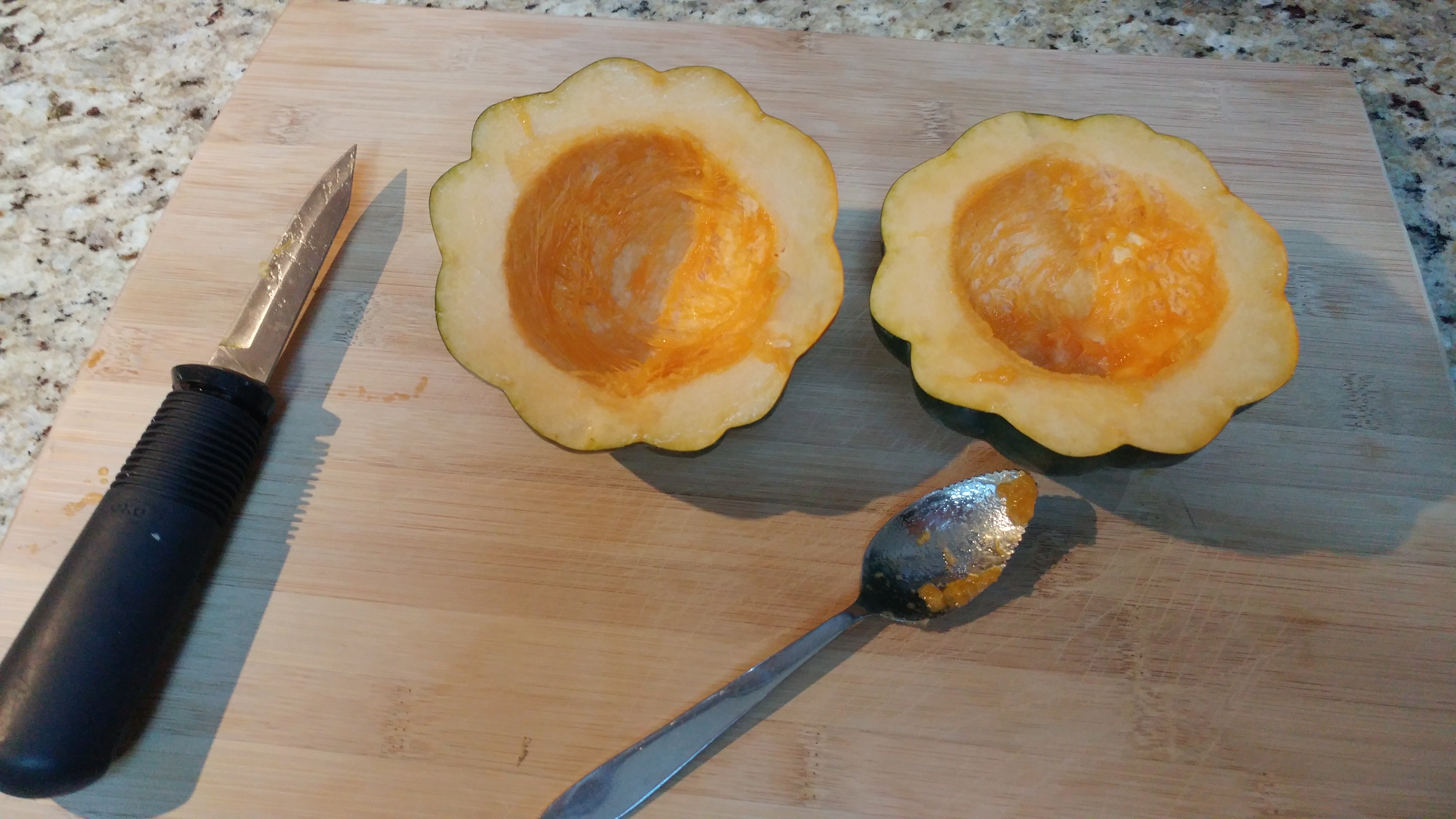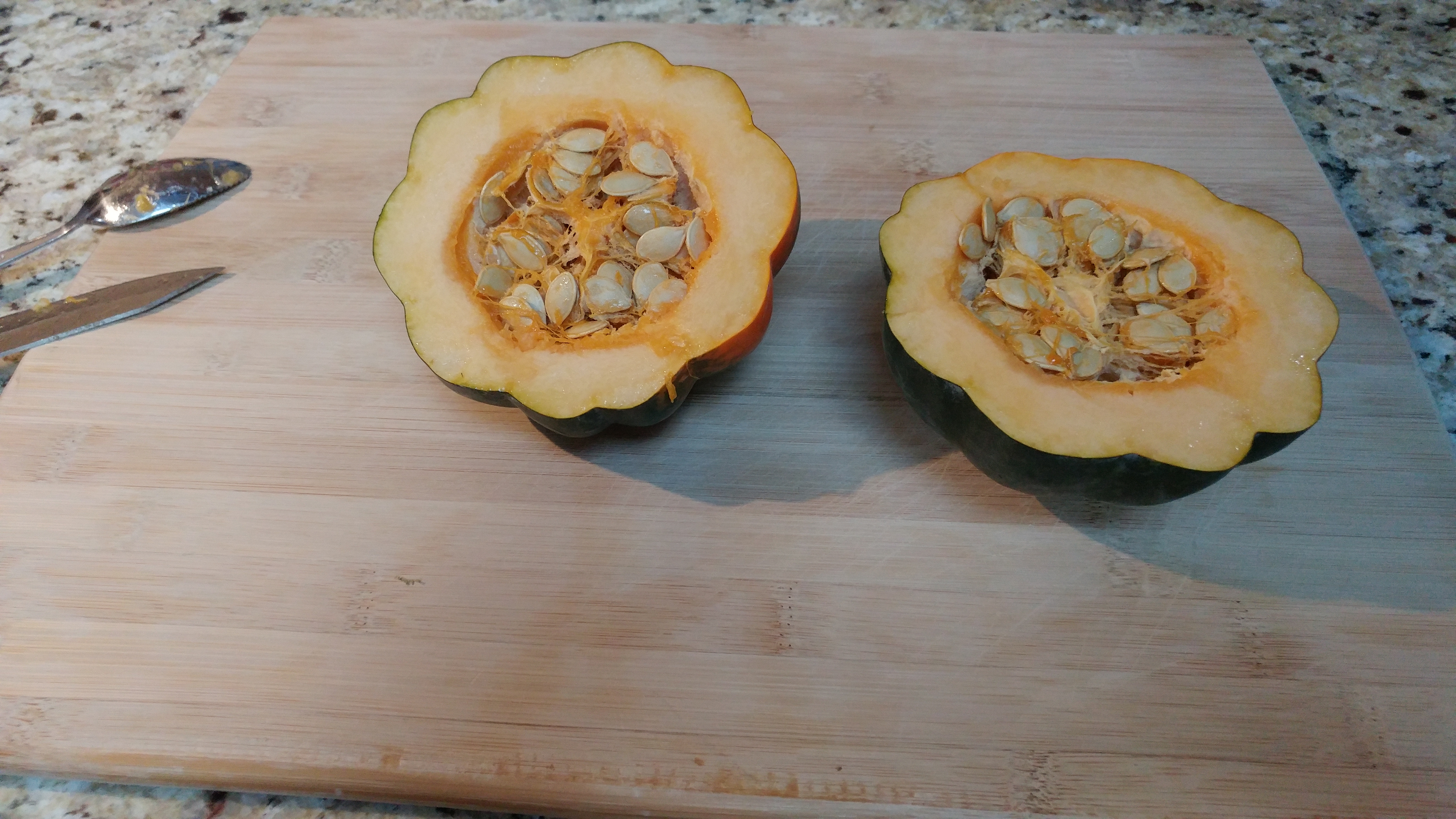 Take seeds and stringy parts out, using a grapefruit spoon. Discard. I have roasted seeds before, but acorn squash seeds are not as good as the ones from sugar pumpkins. Besides, you don’t get as many from acorn squash.