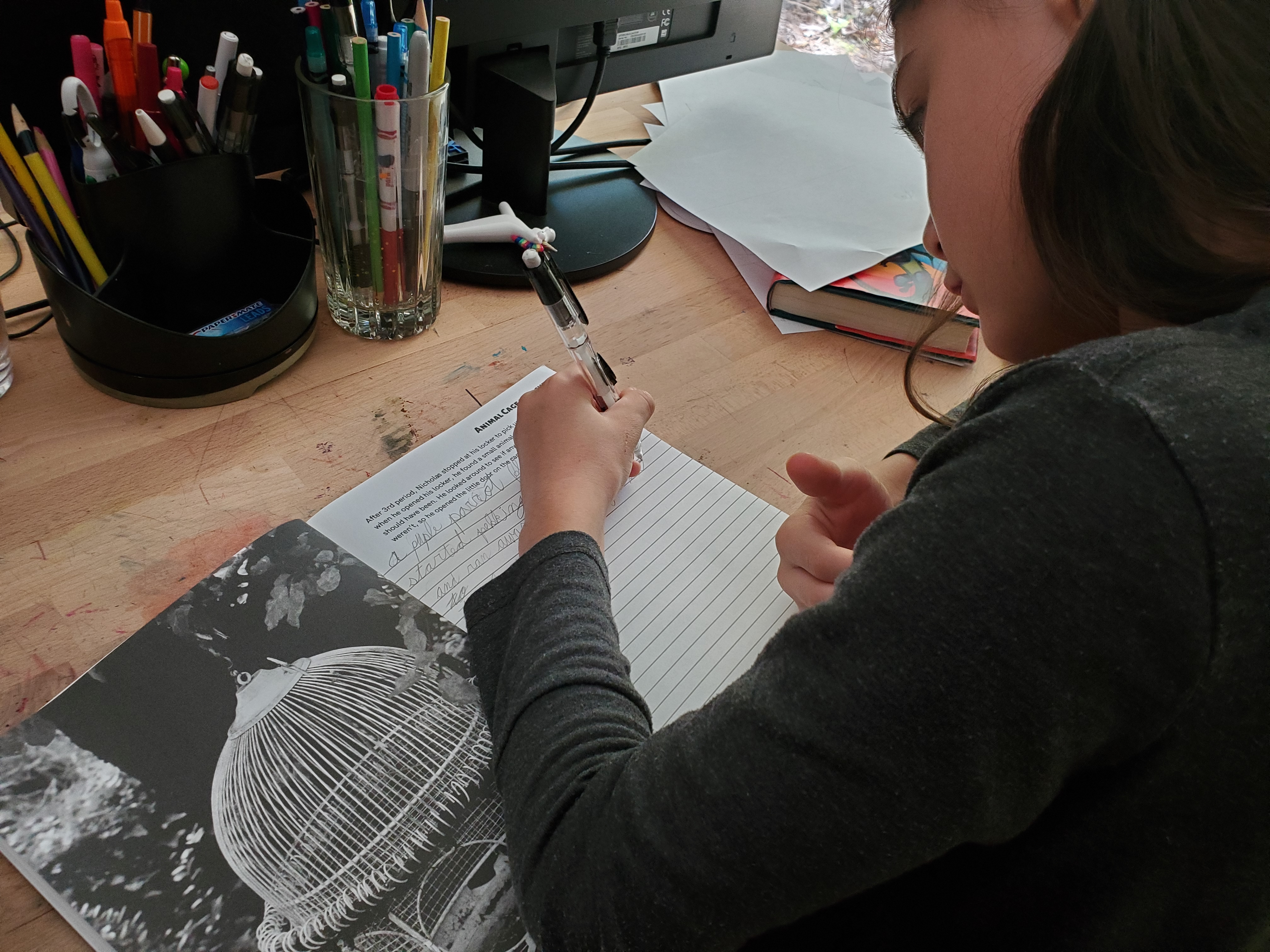 Some prompts give school scenarios like finding a cage in your locker room, for instance, but not many. In this case, I think it is good for a homeschooler to imagine things from public school. My children end up reinforcing the idea that homeschooling beats public school for themselves.