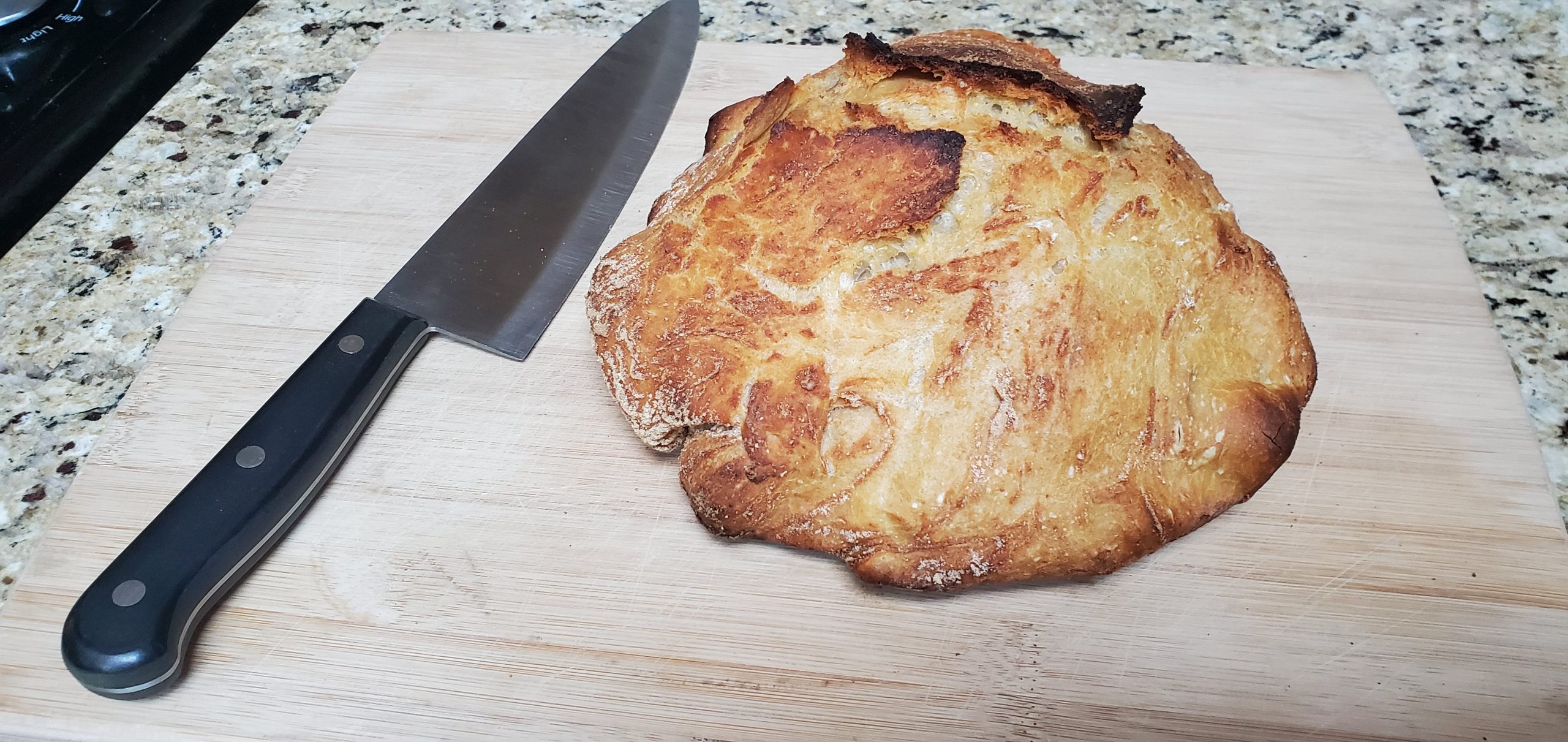 As with any recipe, oven temperatures vary. My bottom oven tends to be slower than my top oven, for instance. So I raised the temperature to 500F, as in the original recipe from Mark Bittman, but then the bread got a bit burned on the crust. We will know for next time.