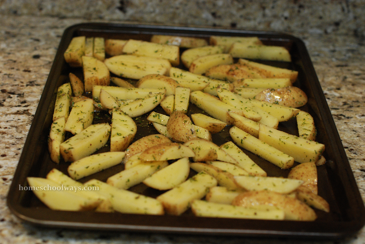 Cut each potato lengthwise into 16 or more pieces. Put them in a medium size bowl. In a small cup, mix the oil with the condiments. Pour the mixture over the potatoes and toss them with a spatula until they are thoroughly coated.