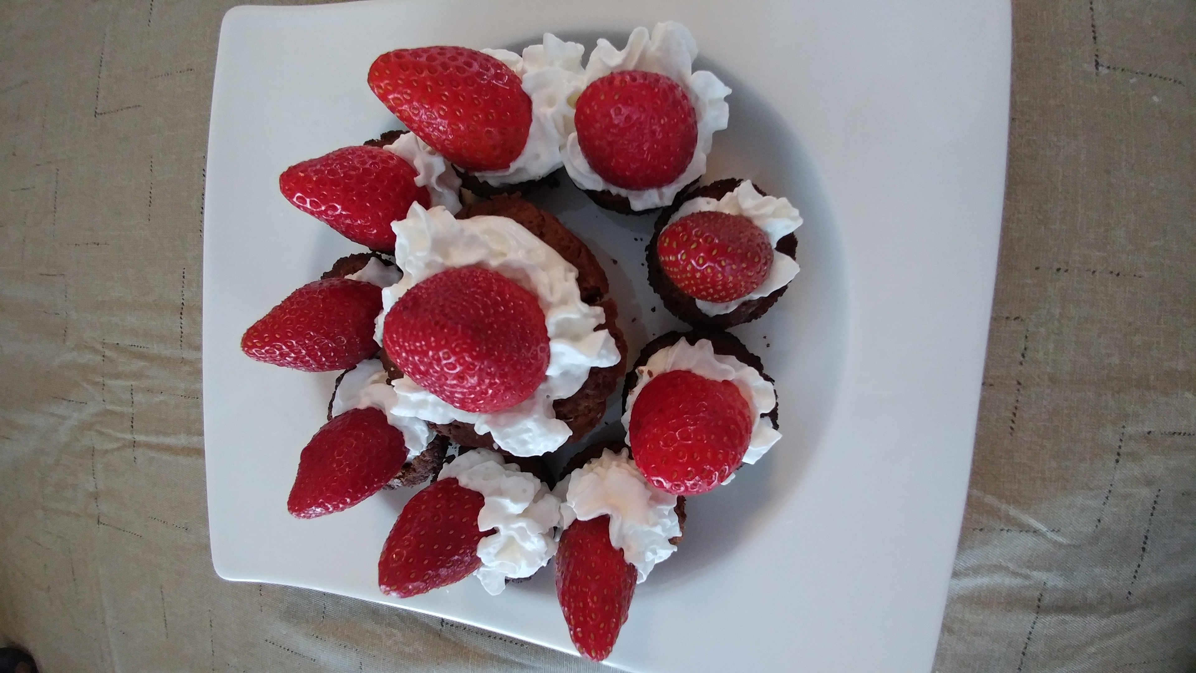 What you need: your favorite chocolate (or carob) muffin recipe, whipped cream (or your healthy, vegan version of it) and strawberries (cut off the end with the leaves). If you are looking for a good muffin recipe, I added mine below, gluten free and vegan.