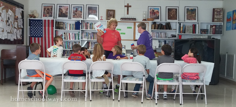 About 22 children showed up, grades 1-8. They were split into three groups by age. My children were together in the K-3 group, which was perfect. These groups rotated between four stations and worked with four different teachers. There was a snack in the middle of the morning. We usually do not snack, but I let the kids do this because it is easier this way. Plus, it buys me time to get home and get lunch ready once camp is over.