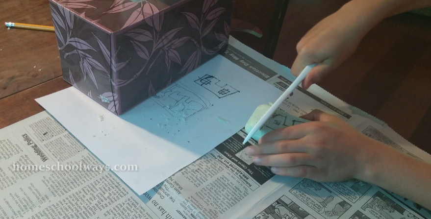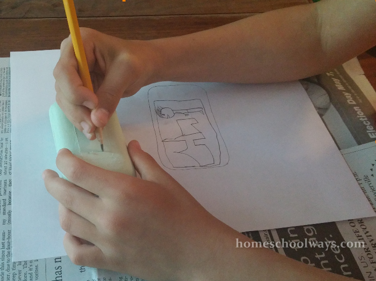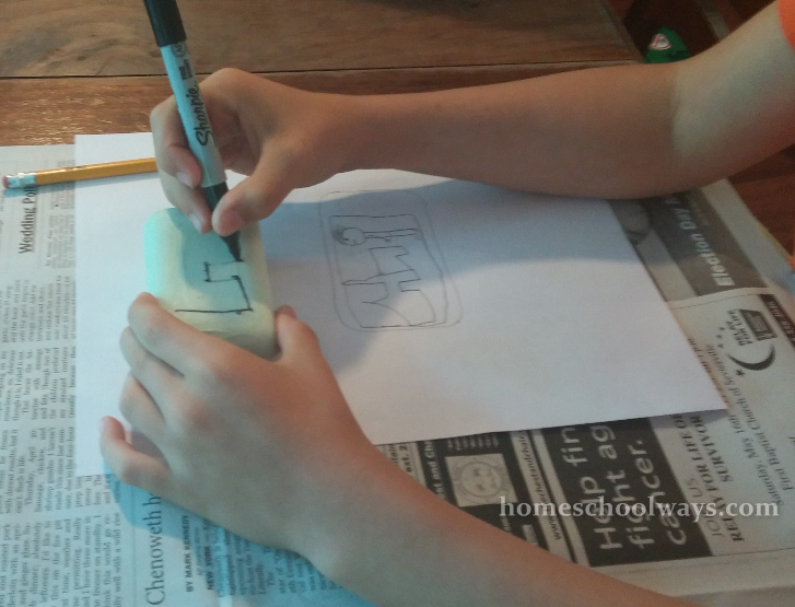 My son decided he was going to make a king standing in front of a city he recently conquered. Then, he noticed there was not enough room for the king. So he drew the building on the soap and started carving. It was harder than he thought, but he did not give up. When he finally got tired of carving, I suggested that he keep more of the soap and just enlarge the building. I helped him a bit and then we washed off the marker lines.