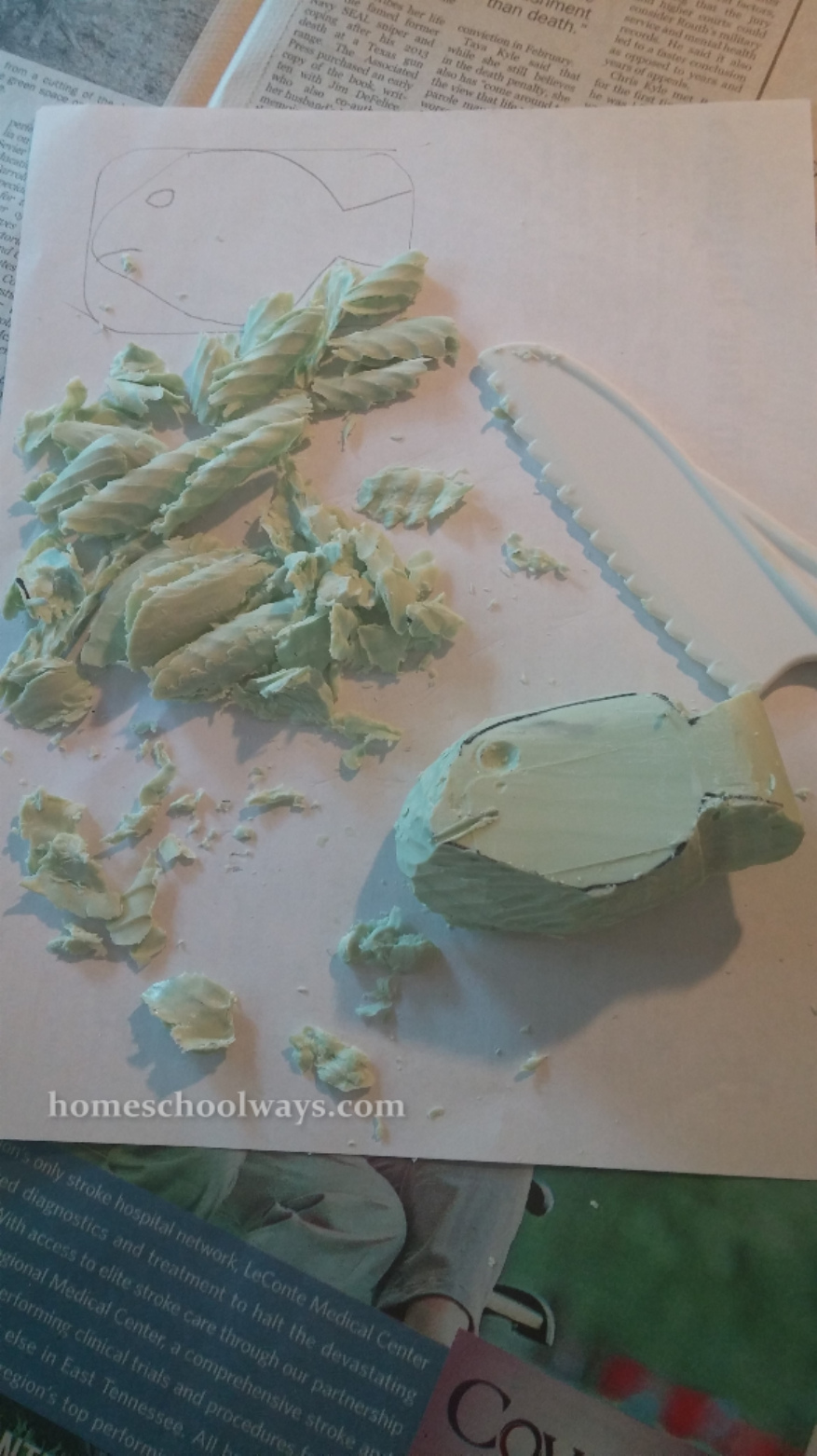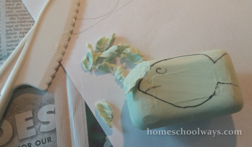 We gathered the supplies and went to work. Shaving was a new technique for us. I used these children’s knives from Amazon (affiliate link). We use them in the kitchen when they want to help me cut up fruits and vegetables. They work for bread, too. And, apparently, they can also be used for carving into soap.