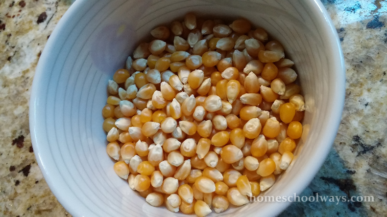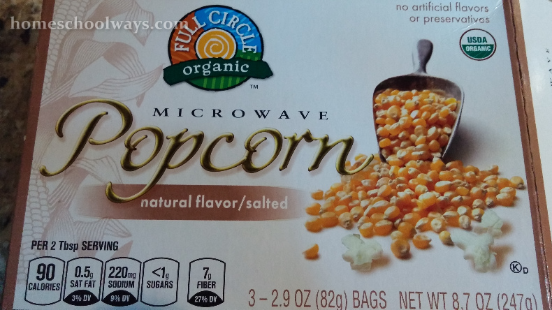 We worked on an edible craft: the moth (peanut) and popcorn medley. I like these edible crafts. I don’t have to worry about storage afterwards. I wondered if I should use microwave popcorn or the real deal, which requires popping in a pan. I decided to go for the easy route. We buy Full Circle microwave popcorn, without butter, which is the healthiest alternative available, as far as I know.