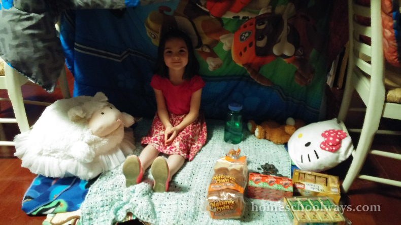 After being very happy with her loot, my daughter invited me in the tent and we sat there enjoying ourselves, admiring our coins (pretend coins from our play cash register), petting our stuffed animals, and wondering if we should start nibbling on raisins or peanut butter crackers first.