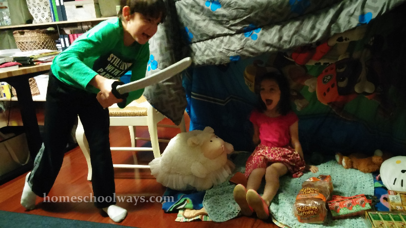 After reading them the stories while they colored Charlemagne, I decided that for our craft/activity we would build a tent and re-enact the battle of Tours.