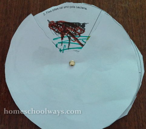 There are two different stories in this chapter, one about the plague itself and one about how the Black Death changed the feudal system. We answered the questions and worked on the map. Then, we did a craft which is a spinning wheel showing the progress of the plague, i.e. its spread from rats and fleas to humans.