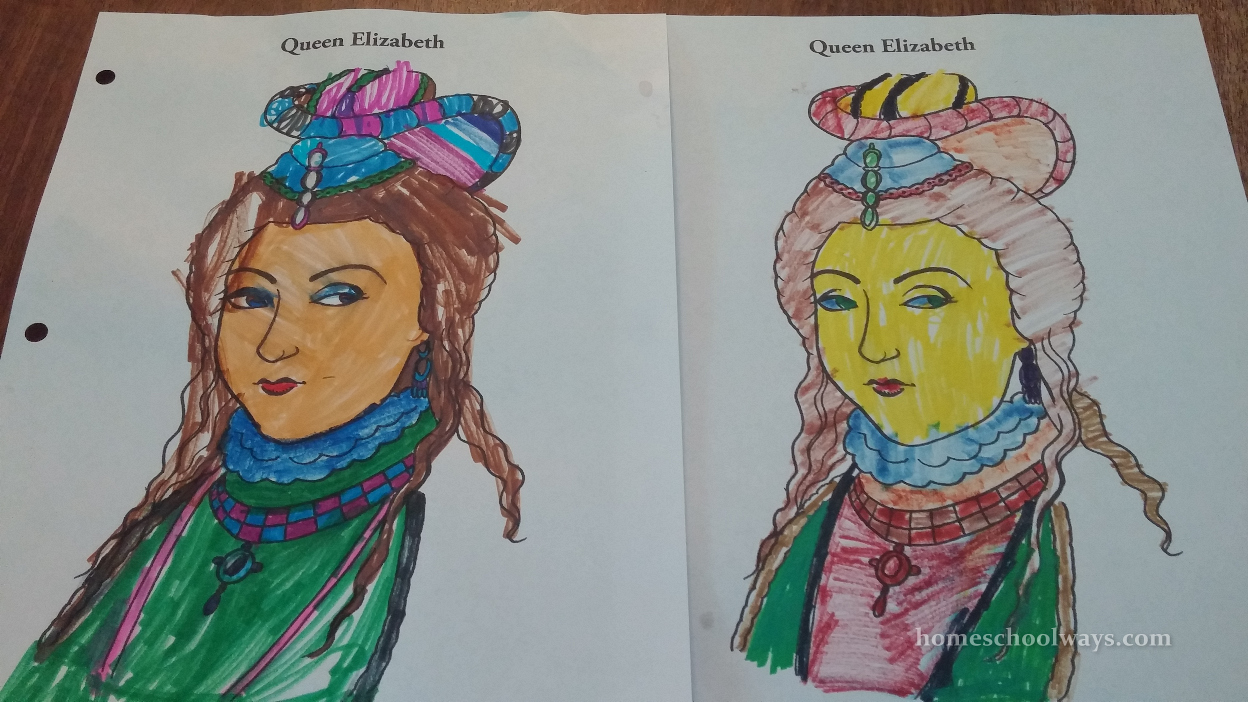 They colored the maps and then the portrait of Queen Elizabeth. This rendering looks quite different compared to the classic portrait of Elizabeth I that we have all seen of her in history books.