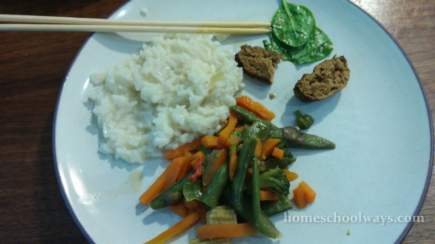 Again, I decided that the best crafts were the ones we could eat. I made a Japanese meal according to the instructions. Rice, mushroom soup for breakfast, sesame seed dressing for green vegetables (spinach in our case), teriyaki sauce for our veggie meat (Frichik), and stir-fried vegetables.