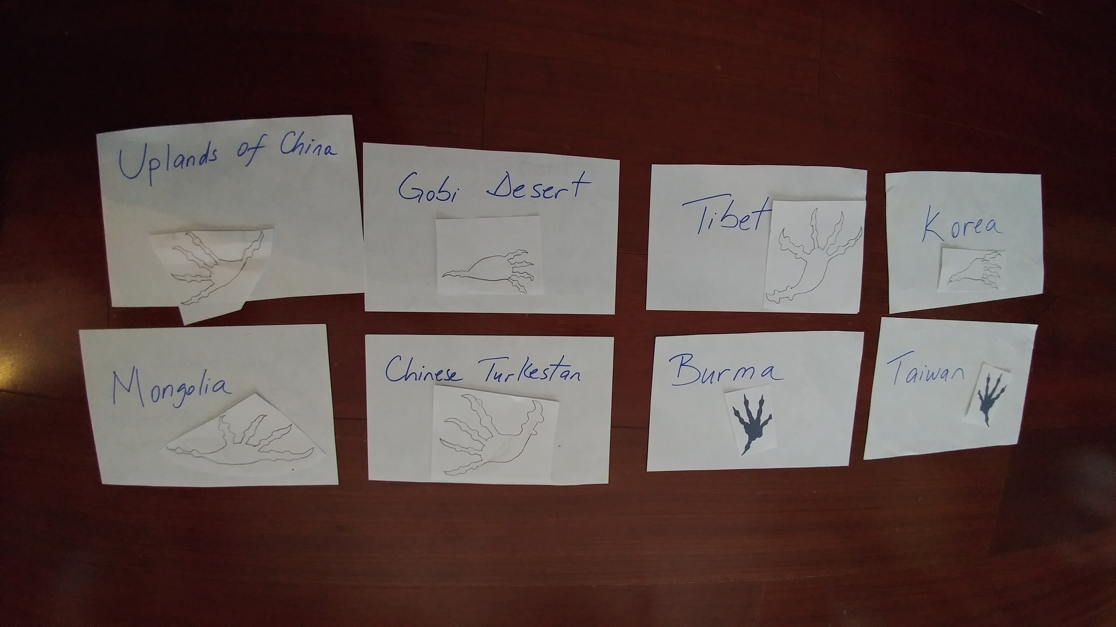 The second story was about the accumulation of land. Susan Wise Bauer places the reader on a dragon who flies all over the different parts of China at the time. It was neat to direct the kids over their maps. Then, we made eight pages with the names of each province and applied a dragon paw print over each.