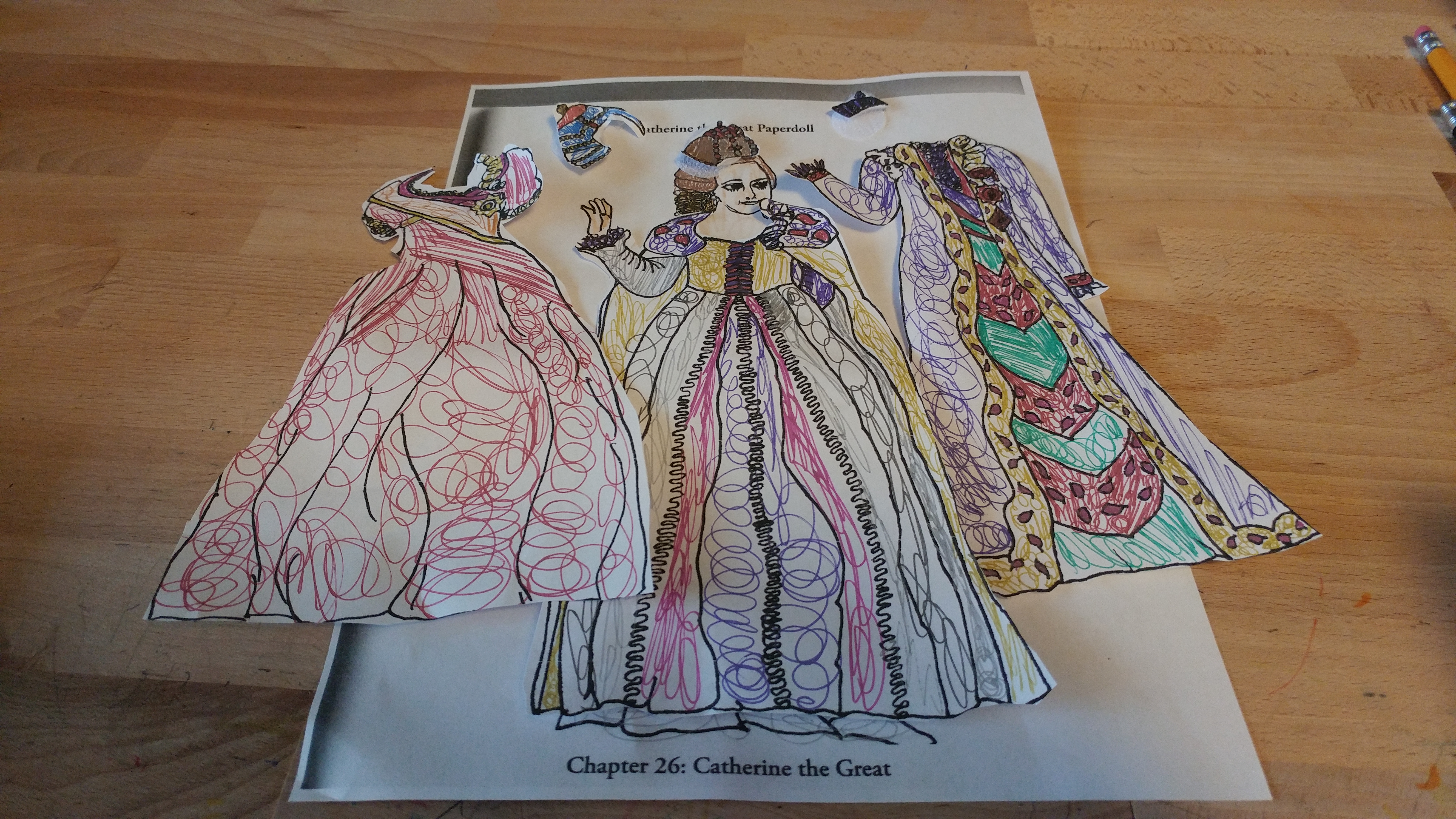 Chapter 26 in Volume 3 took us to Russia. Catherine the Great made a big impression on my daughter. Of course, the paper dolls were a hit. She decorated every single one and made sure she could stick and remove them with Velcro dots.