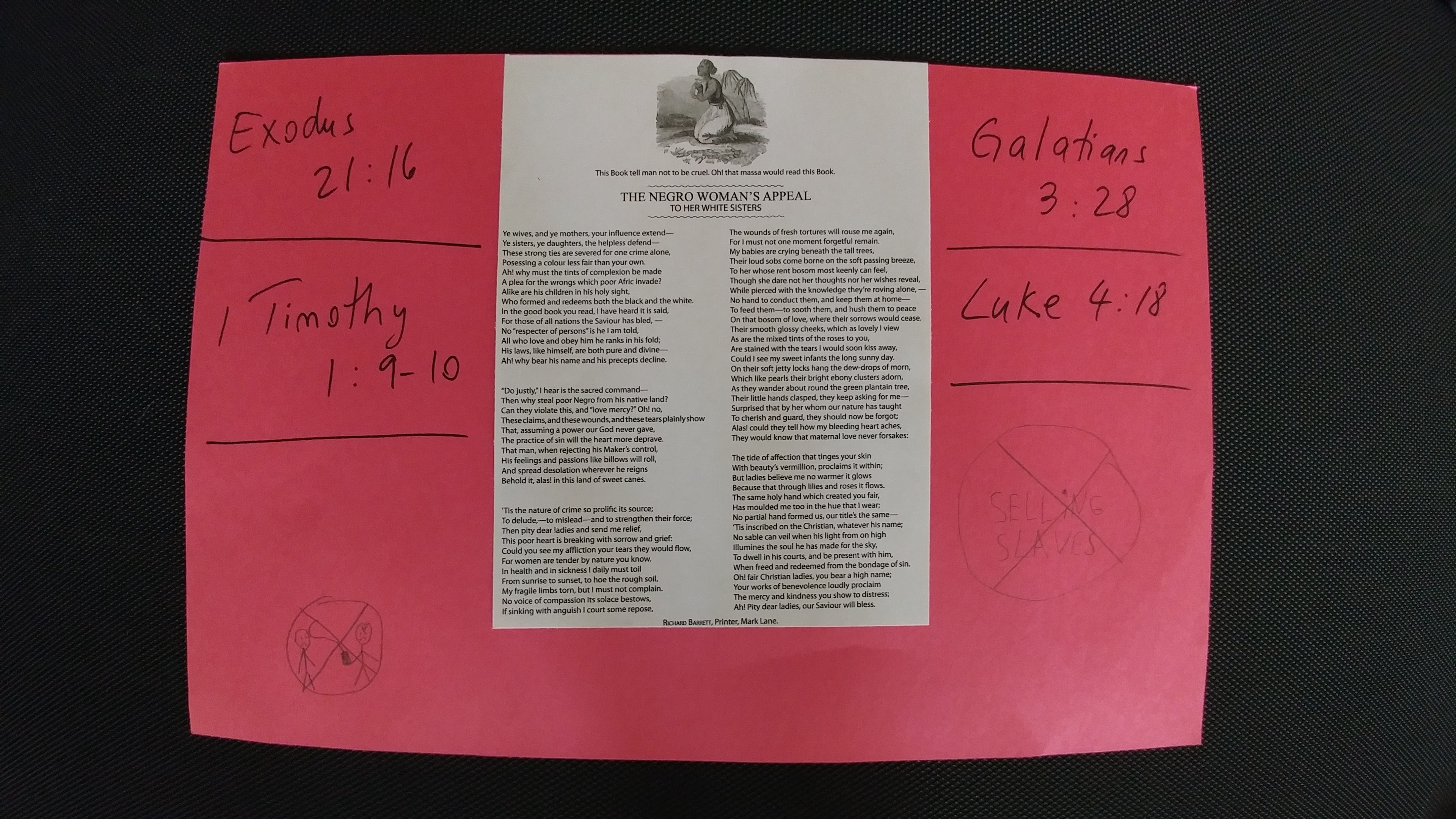 So I opted for a large construction paper in red – a color which demands attention. I made a copy of the poem provided and taped it in the middle. We looked up four Bible verses which condemn slavery and the kidnapping of people.