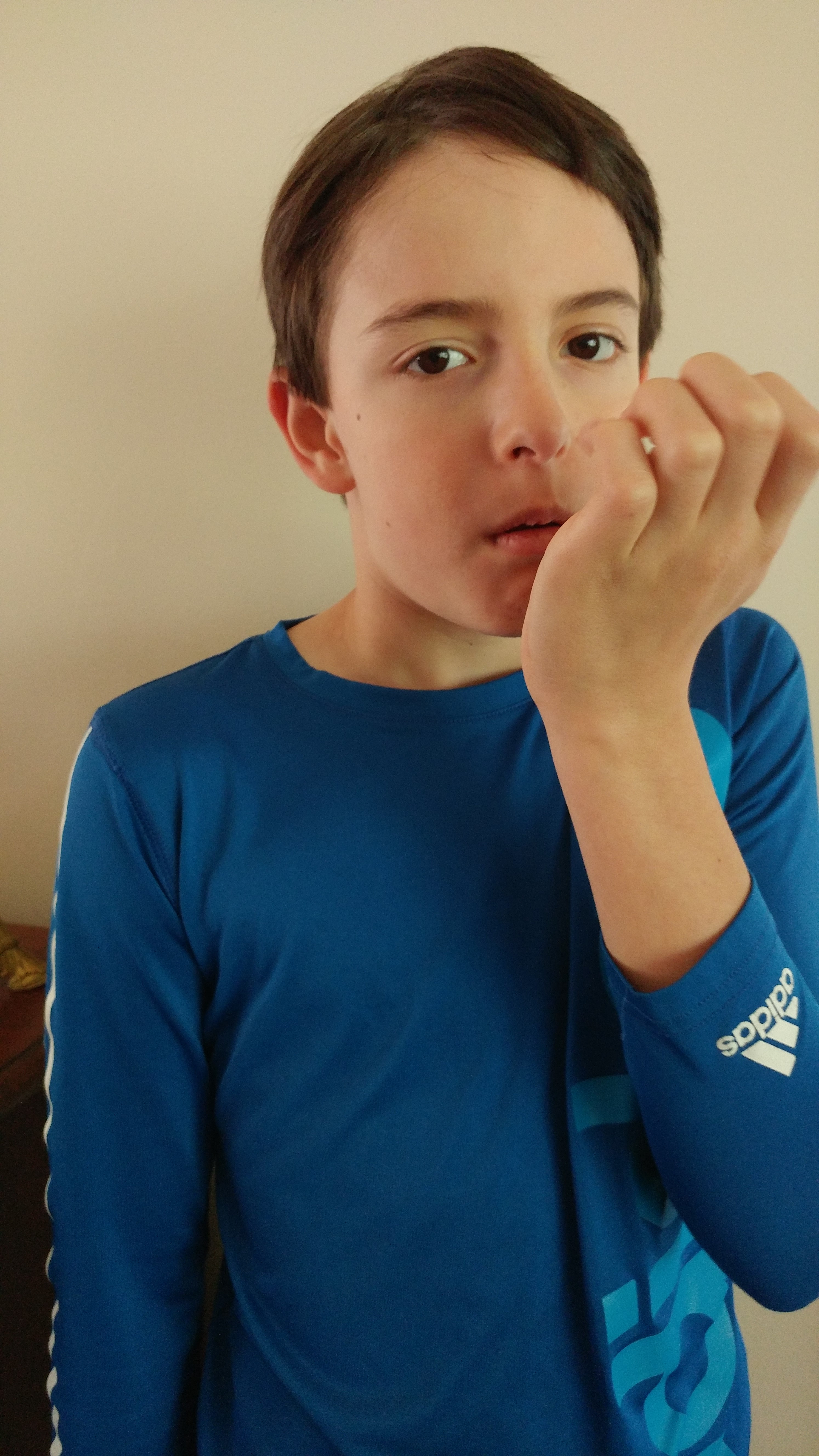 So, we ended up learning about the Native American sign language. The Activity Book provides a page full of signals the American Indians used to communicate. I asked the children to pose for me with one signal. They chose “girl, daughter” and “to drink” respectively.