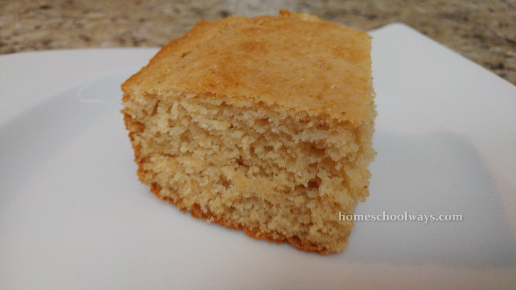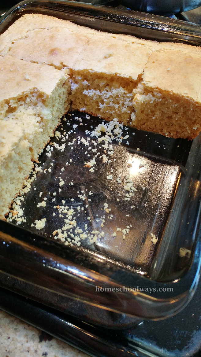 I modified the recipe a bit: soy milk instead of “milk,” vegetarian margarine (we like Smart Balance) instead of “margarine,” and honey instead of sugar. The one egg needed in the recipe can be replaced with Egg Replacer, of course. Even with all the substitutions, the cornbread came out well and everybody enjoyed it. I made some vegetarian chili and a cabbage salad and that was our lunch.