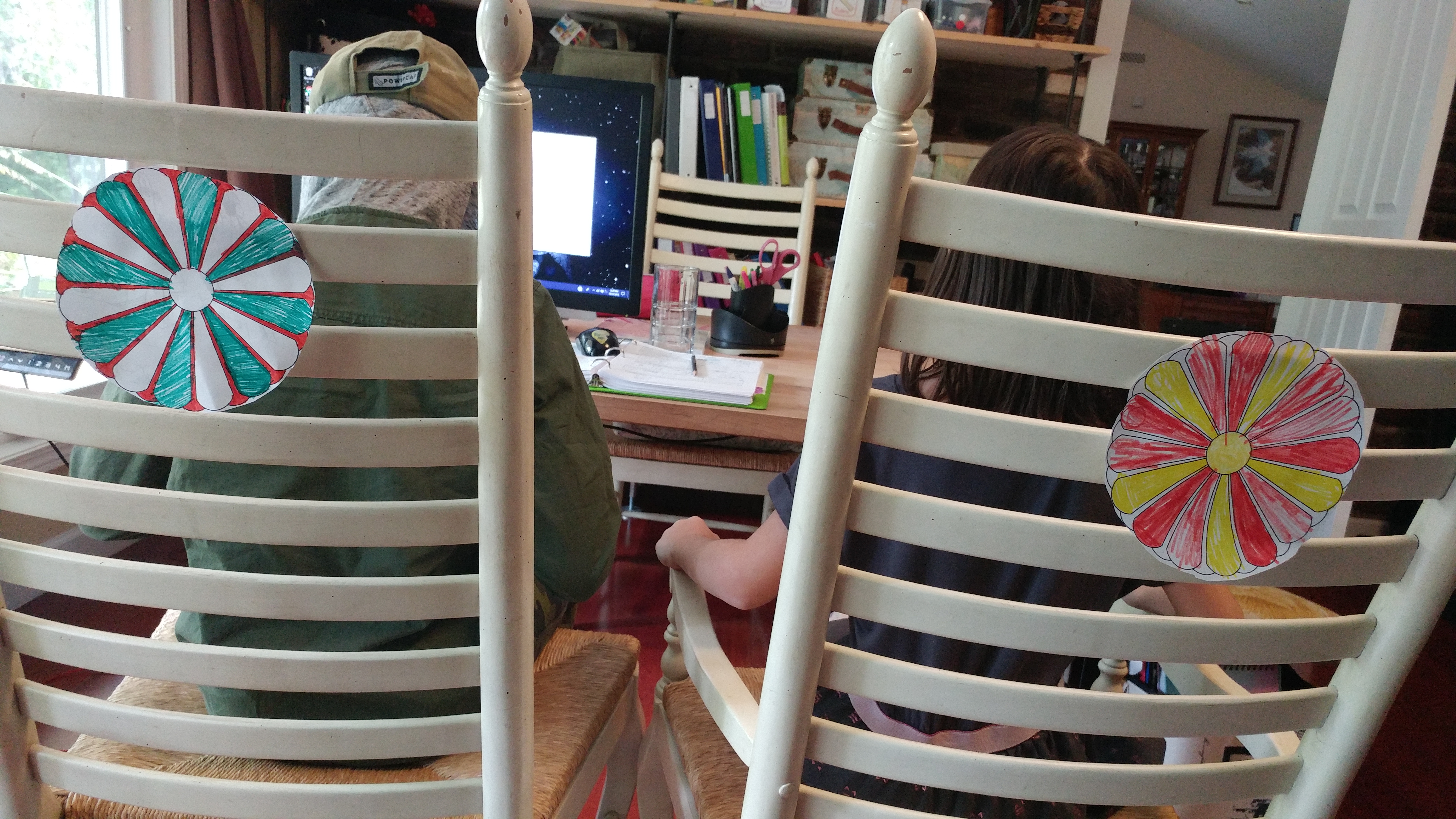 The activity we chose was the chrysanthemum throne. They colored and cut the chrysanthemum paper craft supplied in the Activity Book. Then, we taped them to their chairs in the school room. Done and done.