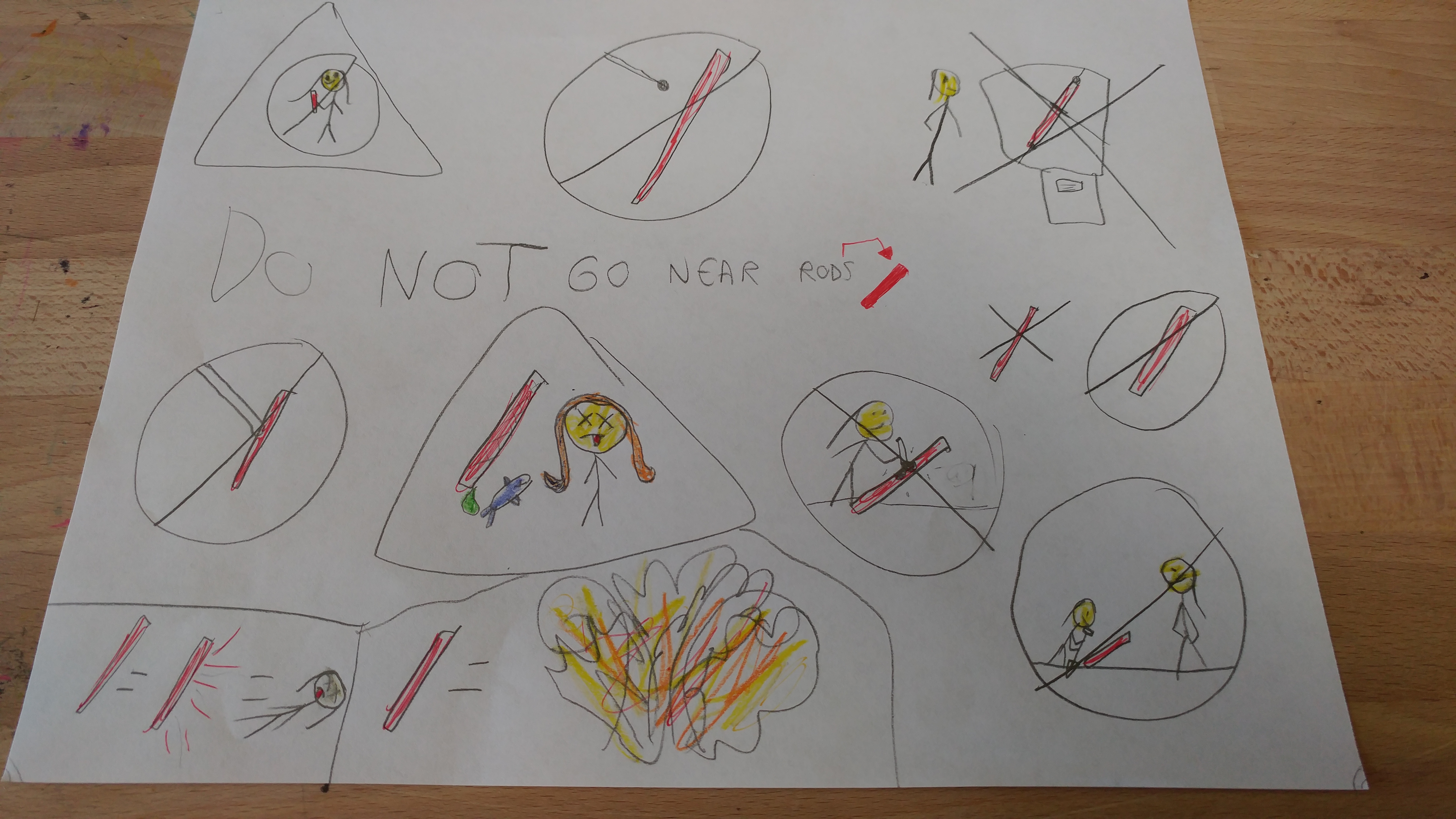 For our craft, I told them to draw a nuclear warning sign – the kind that would warn people 50,000 years from now that nuclear rods are buried there. My daughter did not respect the rule that there should be no words on it, just pictures. Oh well.
