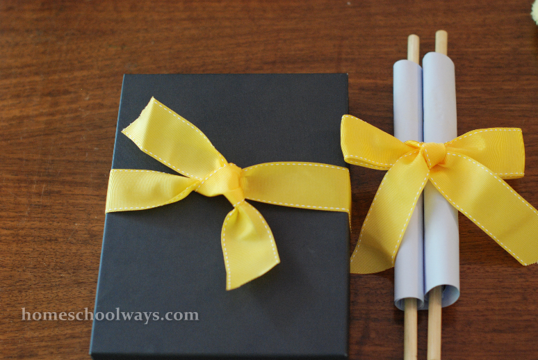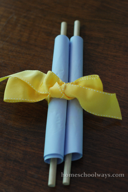 I got the dowels at Walmart. For paper, I used an 8” x 14” piece of paper.