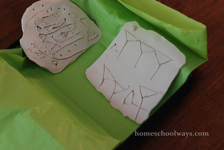Cuneiform letters take a lot of space and our clay tablets were rather small. For clay, we used Sculpey – very easy to use, but it stains the baking sheet. I learned the hard way. So either use aluminium foil or an old tray that you strictly use for baking clay.