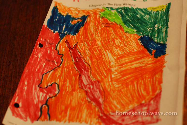 I got online and asked my trusted Facebook SOTW support group how I can motivate my son to do his map work. Many people wrote in confessing they had similar problems, mostly with boys. They just focus on the crafts and comprehension and let the map work go. Others suggested I offer a special set of markers or paints, maybe that will spark a renewed interest in map work (which he has done before without any problems, by the way).