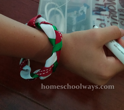 For our craft, we made rakhi bracelets. First, we made one for sister to put on brother. She liked it so much, she wanted a bracelet for herself, too, so we made her one as well. I have not handled a hot glue gun in a while and I got burned, several times. Ouch! So be careful if you are doing this, too.