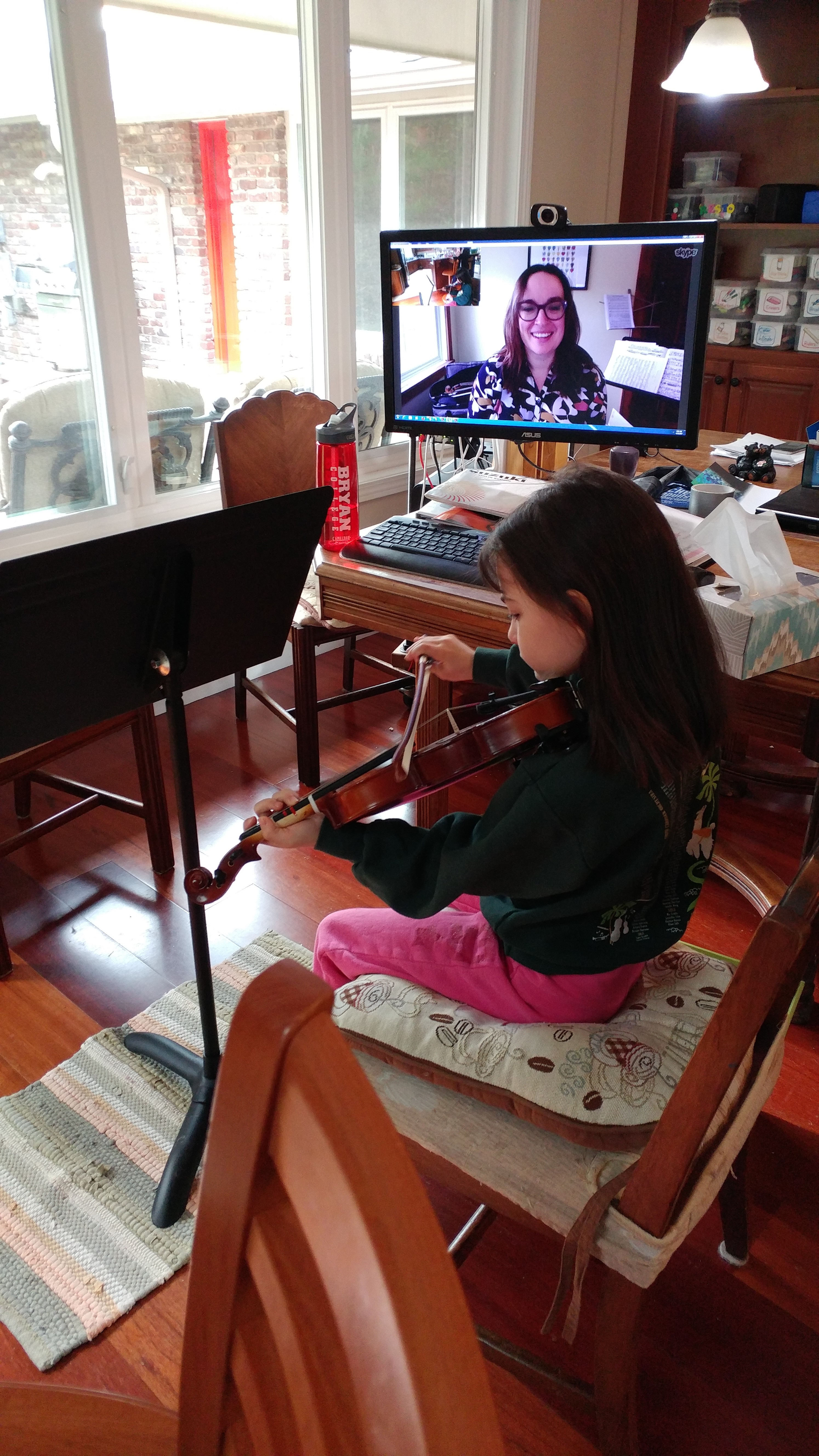 My daughter plays a piece by heart for her violin teacher, via Skype.
