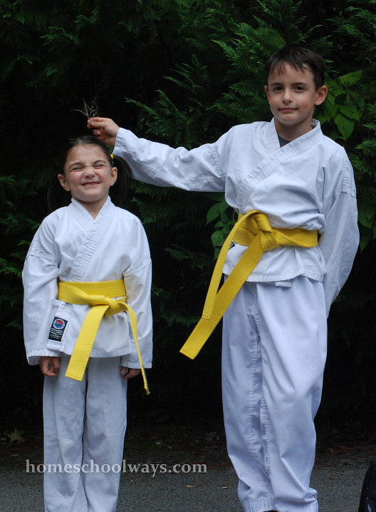 I feel like my son is a knight-in-training. He loves war. He has dreams of training the Gatlinburg Police Force as ninjas to fight bad guys. His sister imitates him in everything he does, so they both had a desire to learn martial arts. Since most of the things we do in our homeschool require lots of motivating on our part, we were very happy to provide one activity the children were eager to do.