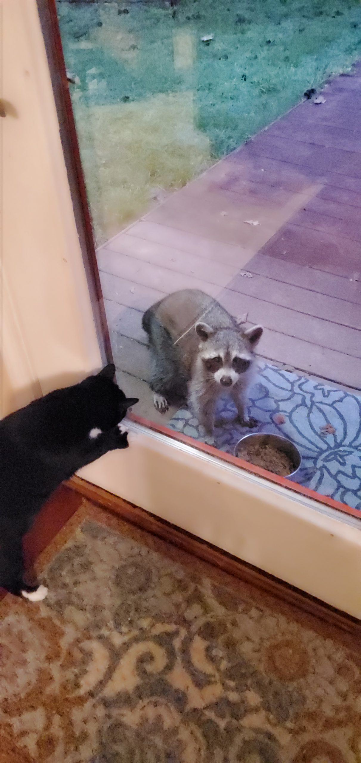 We feed outside cats, but this week we got a surprise visitor. Shrub, our only cat until this week, is watching it.