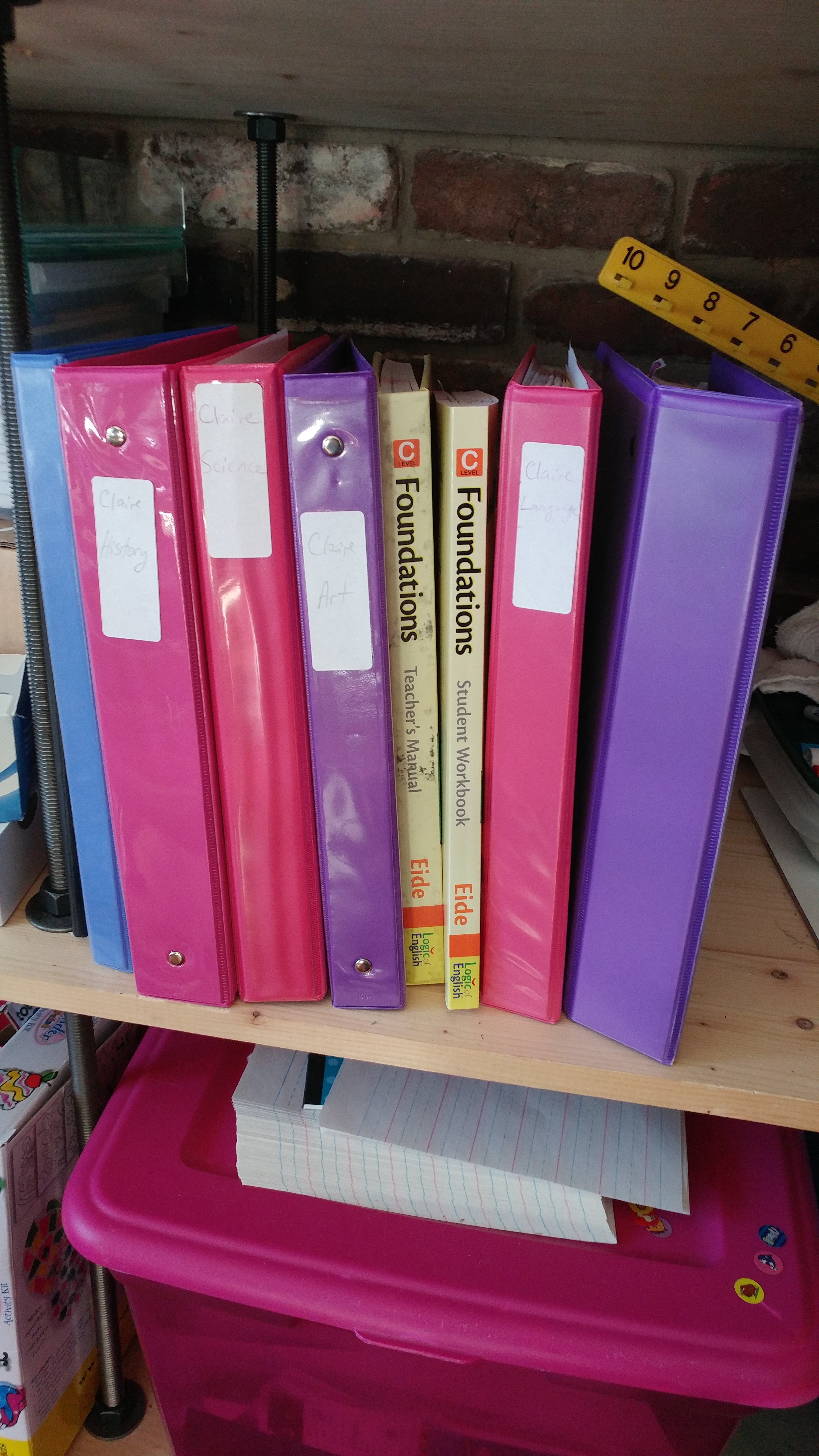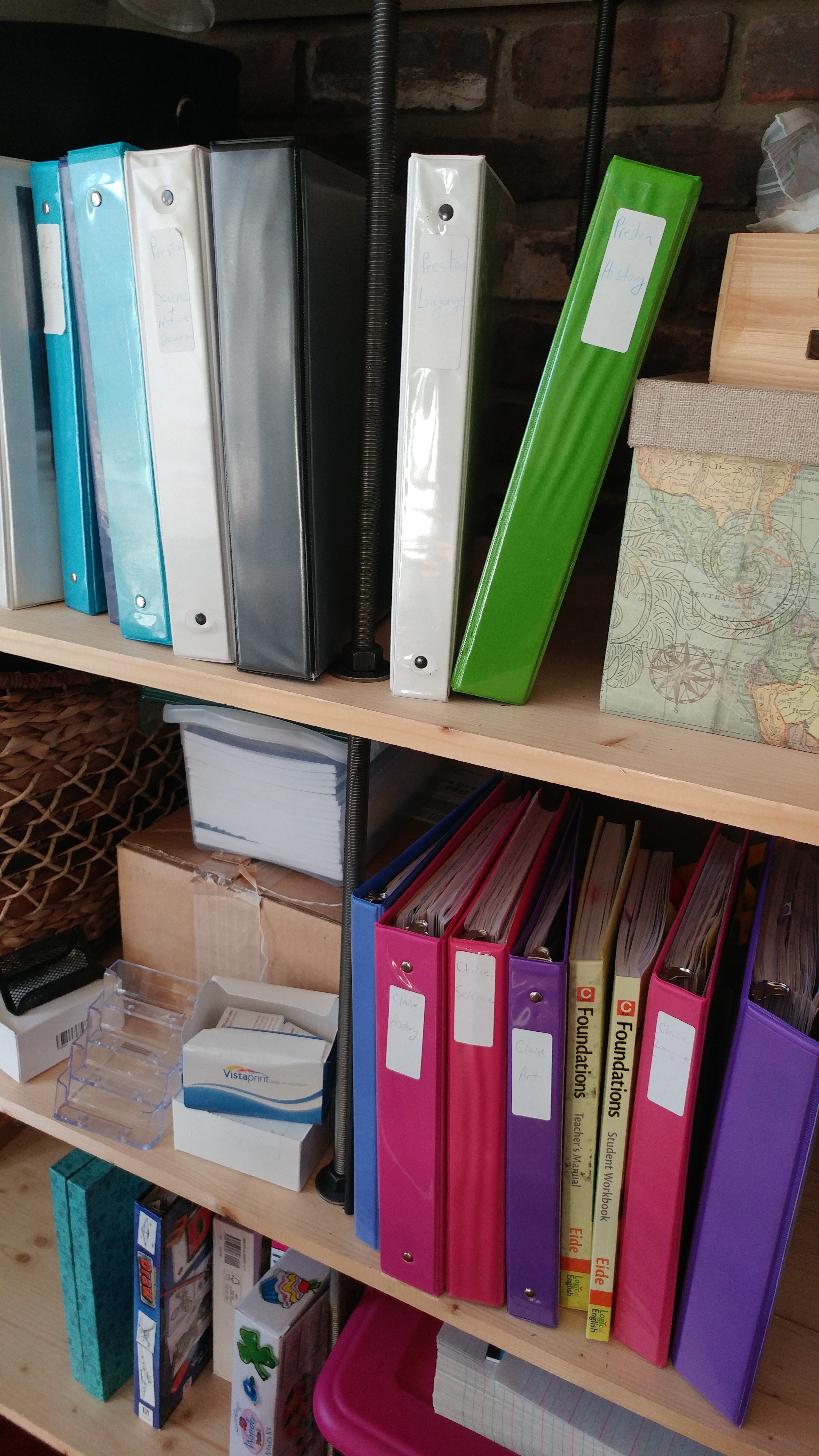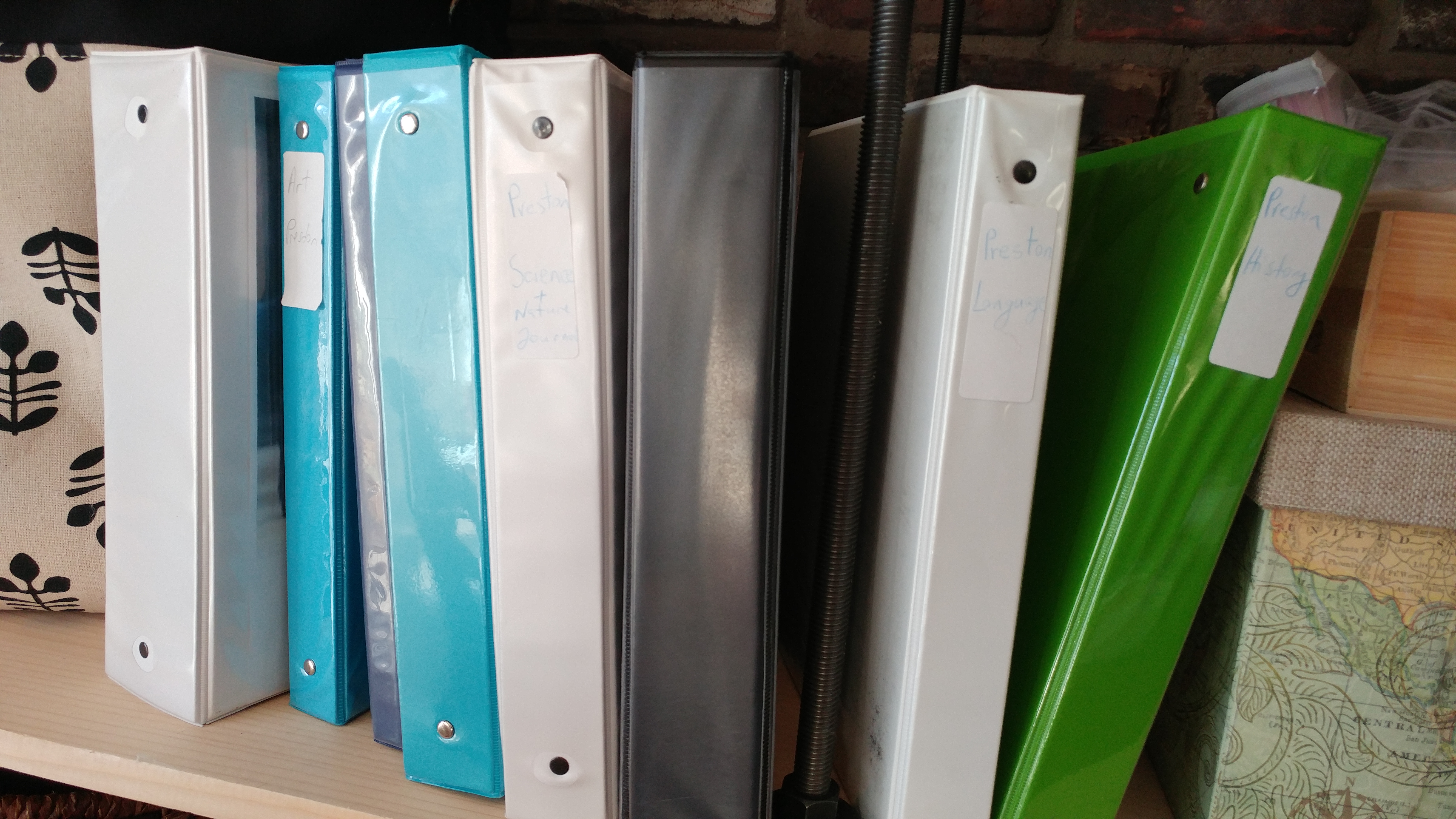 We have four binders for each child: Science, History, Language, and Math. They also have an Art binder and a Travel binder. My son has two additional binders which are empty. He meant to do something with them and then forgot all about it. See? We are not perfect.