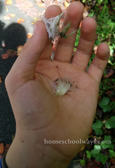 We split open the stem to see the milk inside, but it had dried up. I guess we got to it too late in the season. However, it was not too late to observe the seeds and the dandelion-like white puffed up flower.